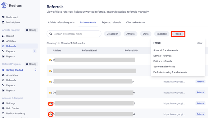👉 Reditus has built-in fraud prevention tools, including duplicate detection (referral & affiliate program), google ad detection, same IP detection, same email detection and more! We will give you a warning when we spotted any of these typical ways of fraud.