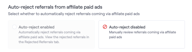 See below a toggle which allows you to auto reject affiliates coming from Google paid ads, if you don't allow affiliates to run paid ads; you want to turn this on. When turned on, we will auto-reject referrals, so affiliates don't get any success with it.